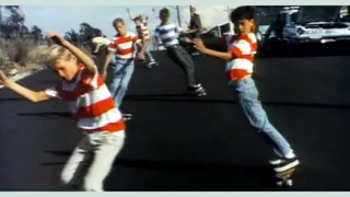Skate cinematography as a genre is so crammed with artistry and innovation that it’s easy to forget that skate videos really started as extended ads—for boards, clothes, wheels, trucks, shoes and energy drinks. Most skate videos have been affiliated with brands, with skaters as ambassadors. In the late 1950s and early 1960s, skateboard companies such as Roller Derby and Hobie featured hand-drawn ads of children standing on thin decks with their feet close together like idiots about to slip on to their backs. Short films from the period, like Bruce Brown’s “America’s Newest Sport” (1962)—which features a surf-rock soundtrack over clips of young boys in Where’s Waldo? shirts cruising around on flat ground—functioned as infomercials, with a narrator itemizing the product’s features as skaters demonstrate them. However straightlaced the marketing was, skateboarding briefly boomed in this period, and skate parks emerged across the U.S. The introduction of contests and events in mid-’60s and early-’70s California and Florida gave skating a sense of a formalized activity akin to other youth sports. Videos from the era often highlight competition notices or non-skateboarding commentary from news reporters. It wasn’t until the 1980s that skater-owned companies and skate teams (a group of skaters sponsored by a brand) created what we now think of as the modern skate video.
